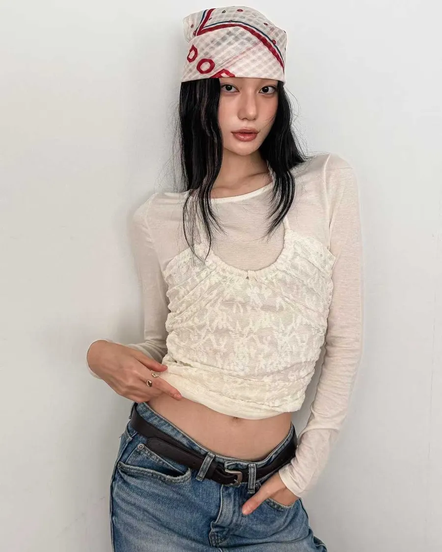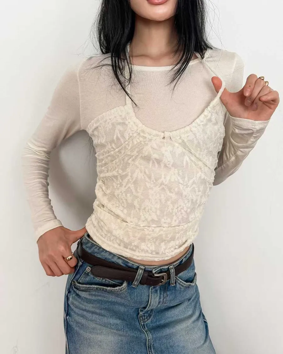 PARTYAN 韓國直送 Maison Délacé Mesh Layered Top 美頌.蕾絲網紗疊穿上衣