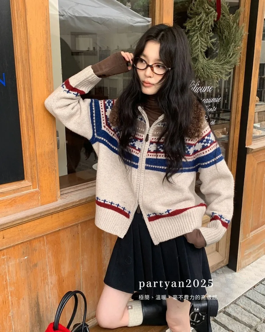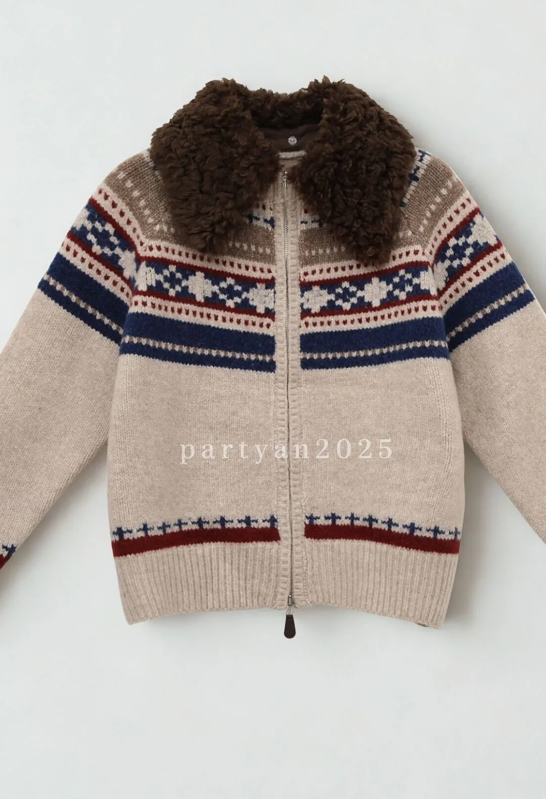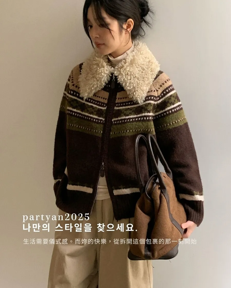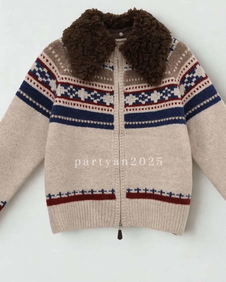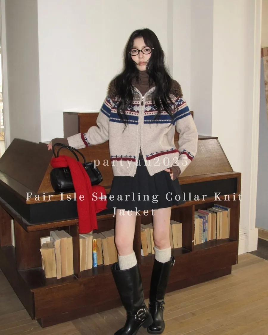 PARTYAN 設計款 Fair Isle Shearling Collar Knit Jacket|費爾島毛領拼色羊毛針織外套