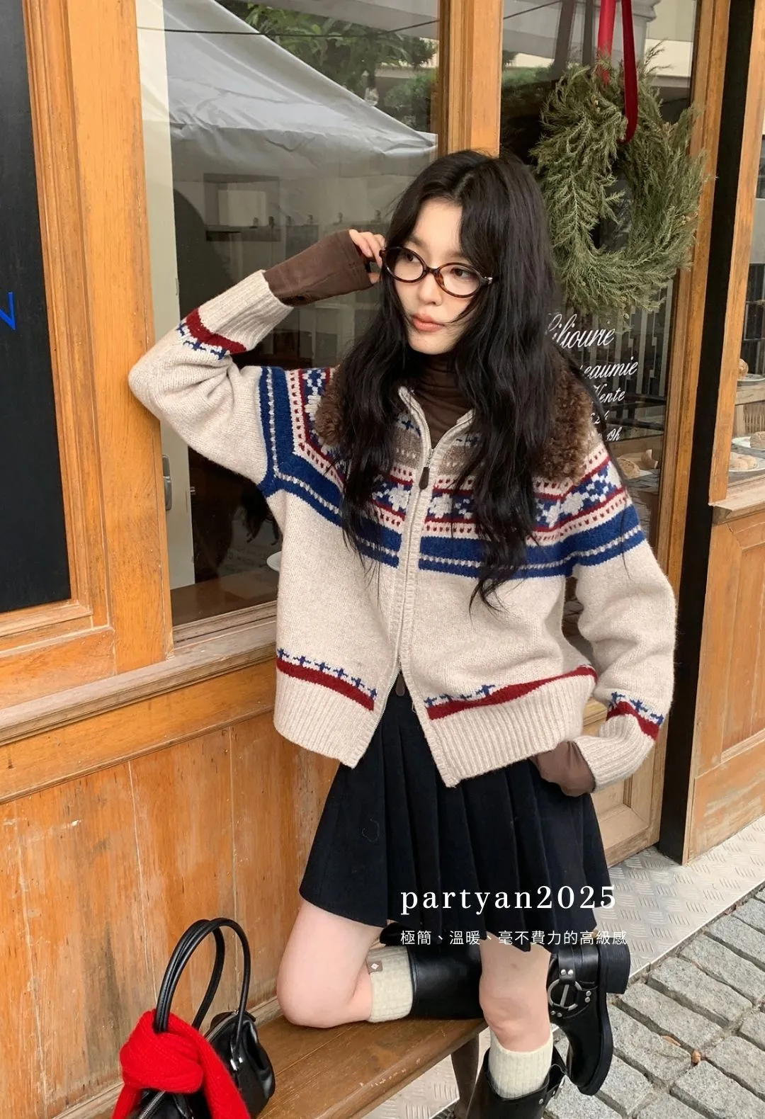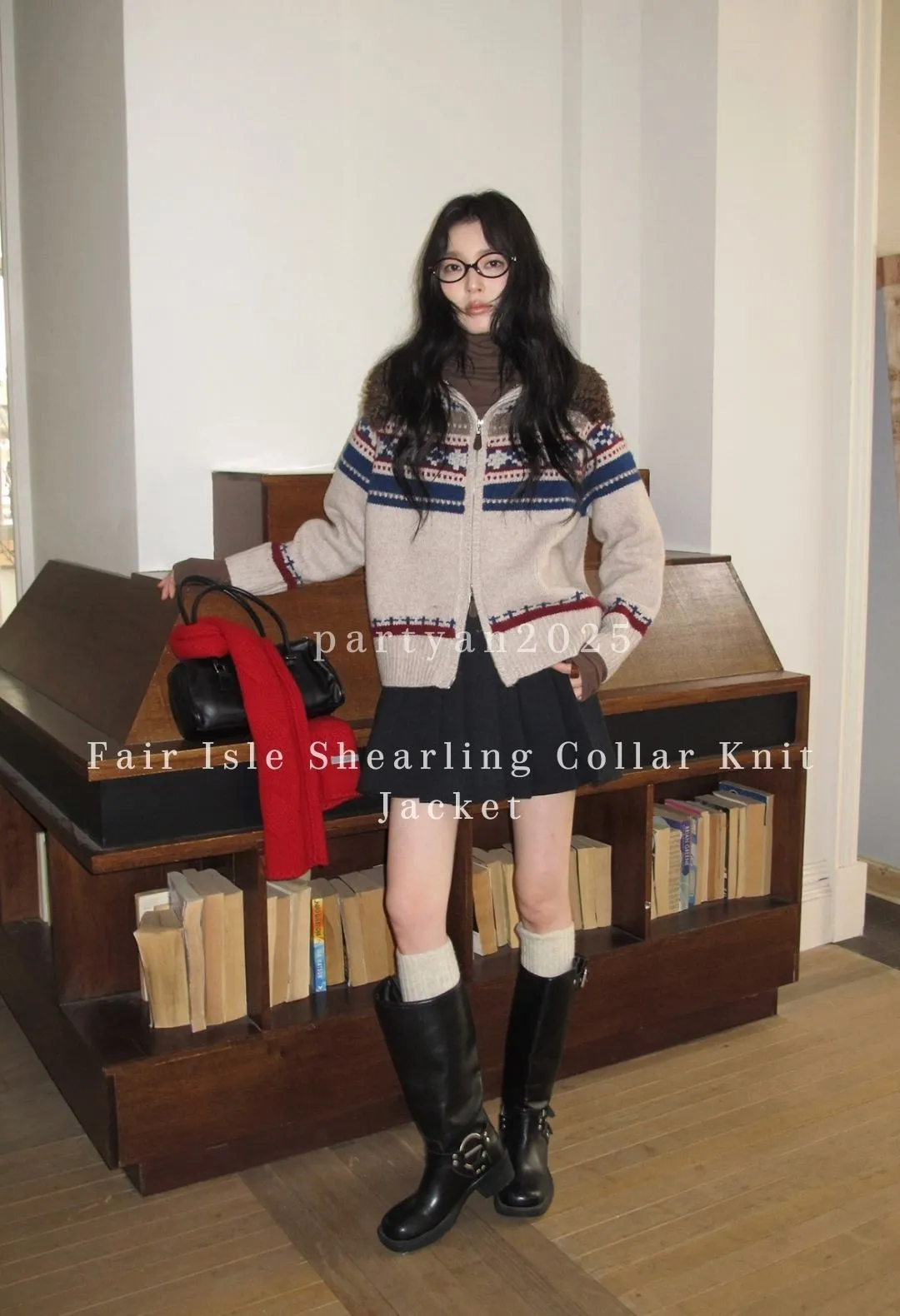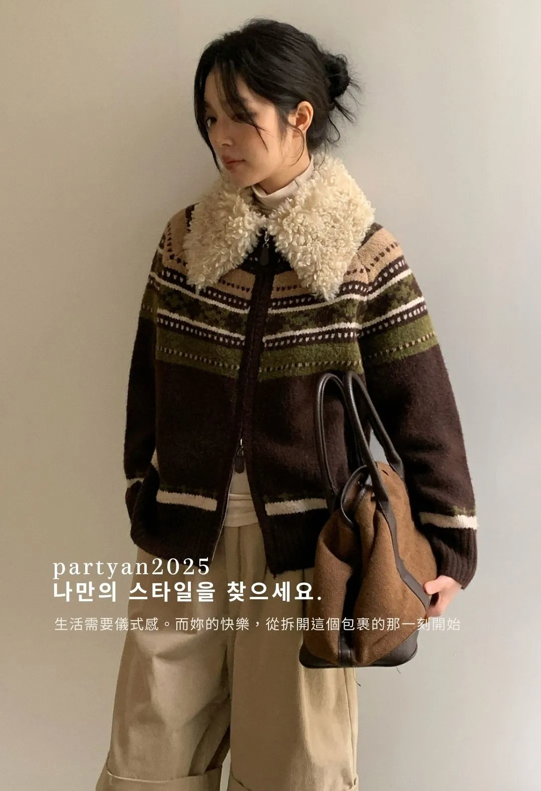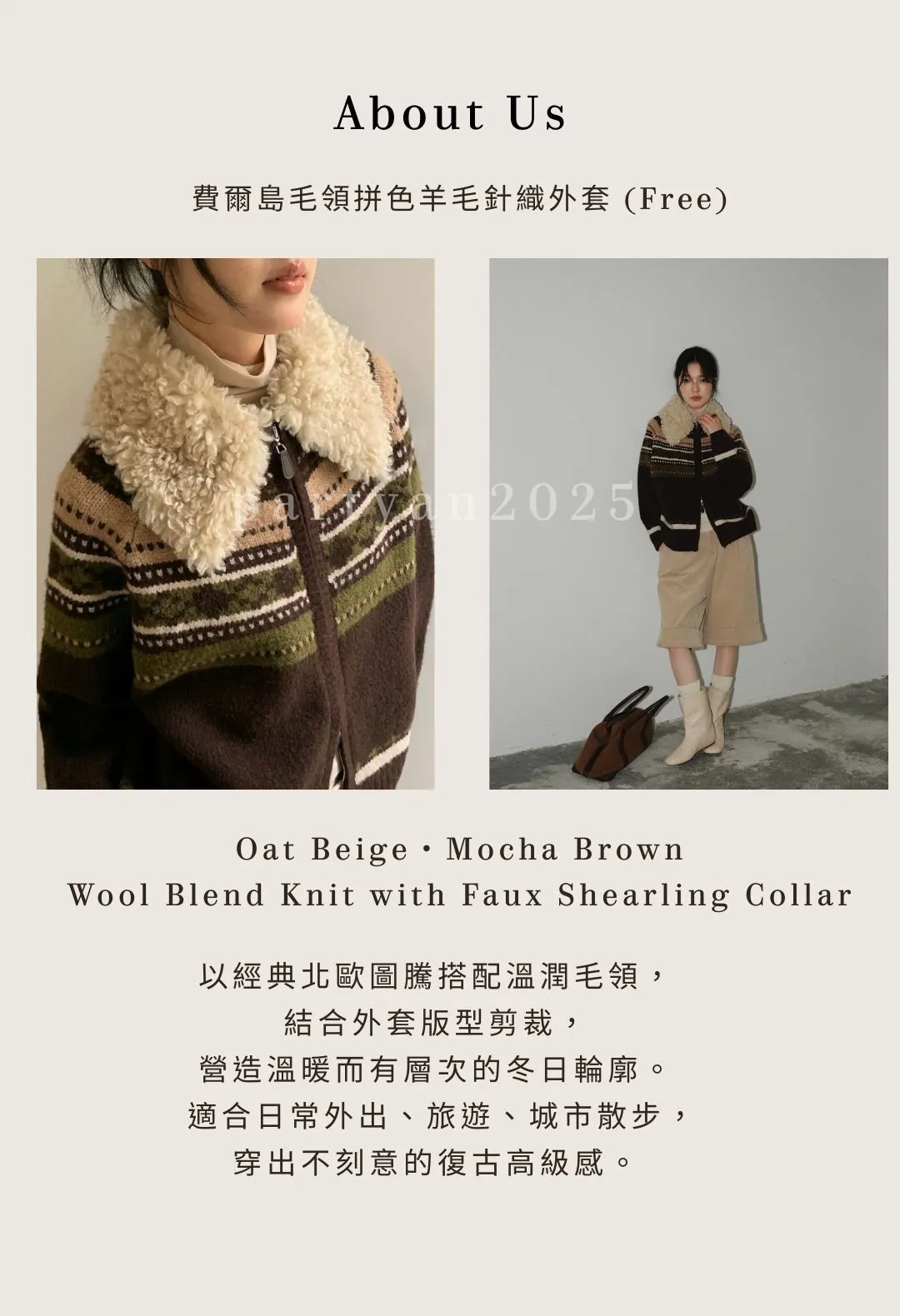 PARTYAN 設計款 Fair Isle Shearling Collar Knit Jacket|費爾島毛領拼色羊毛針織外套