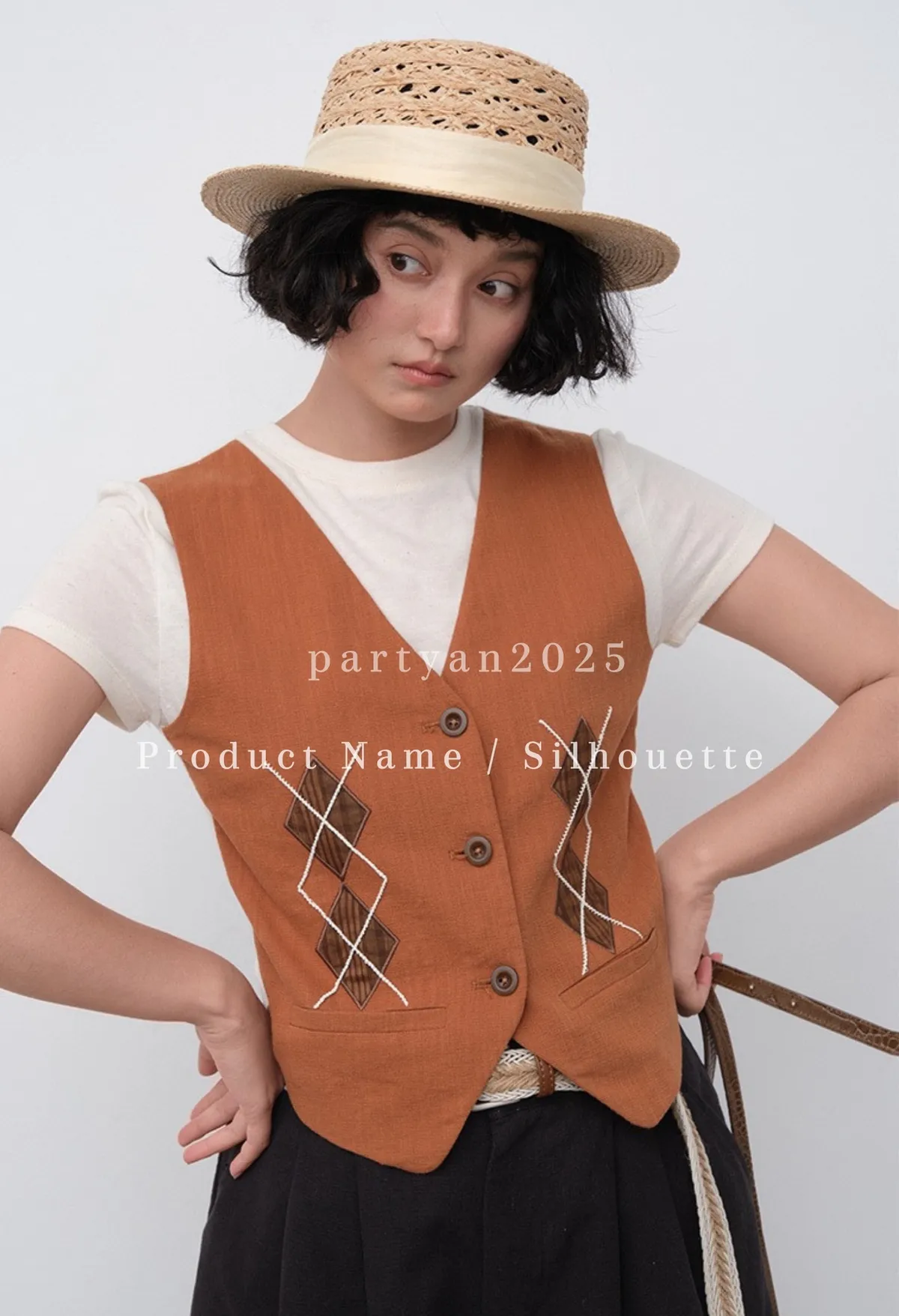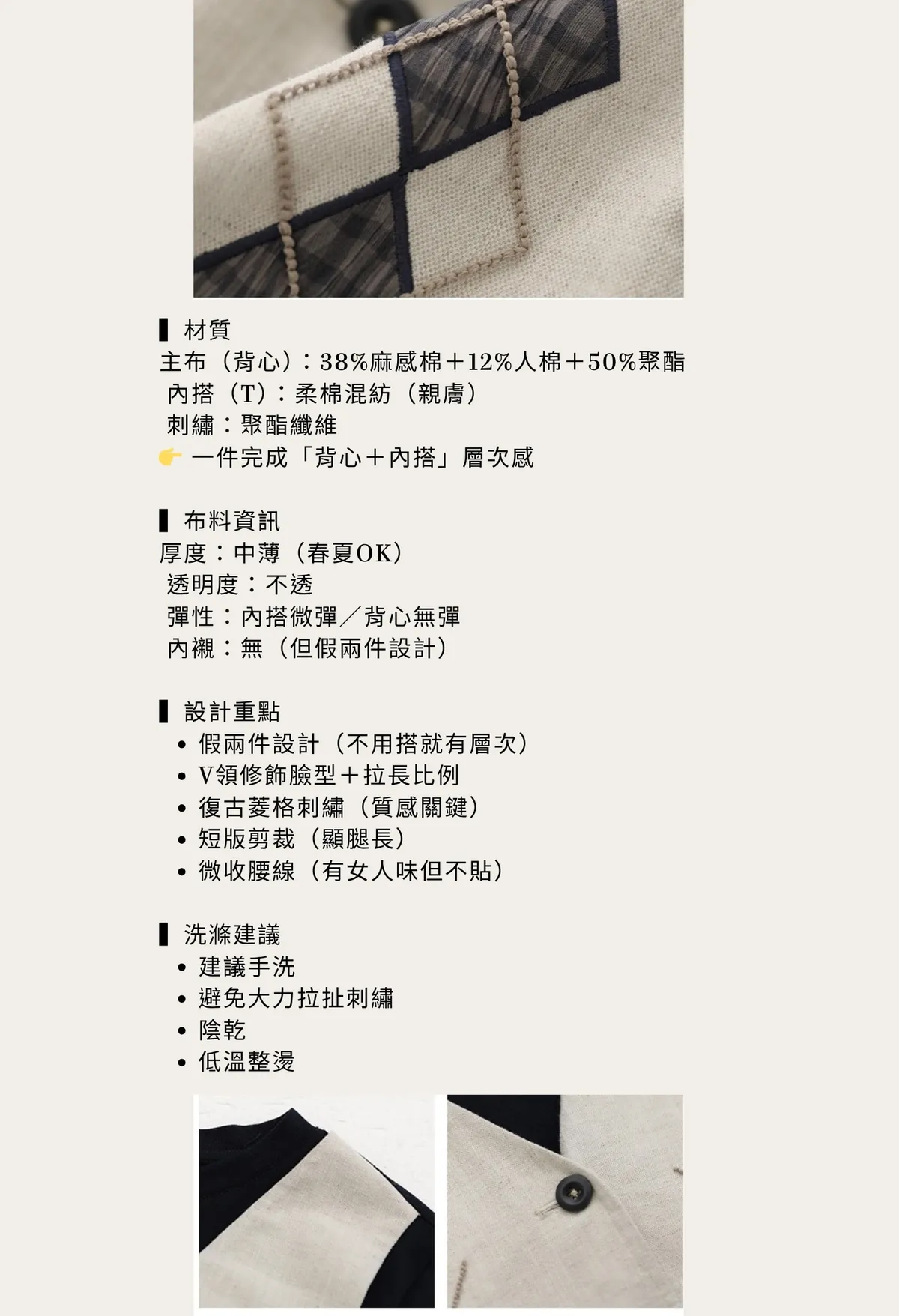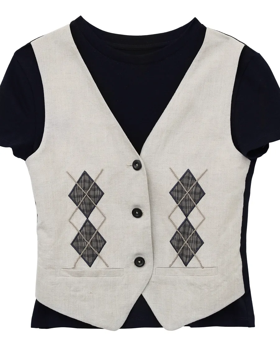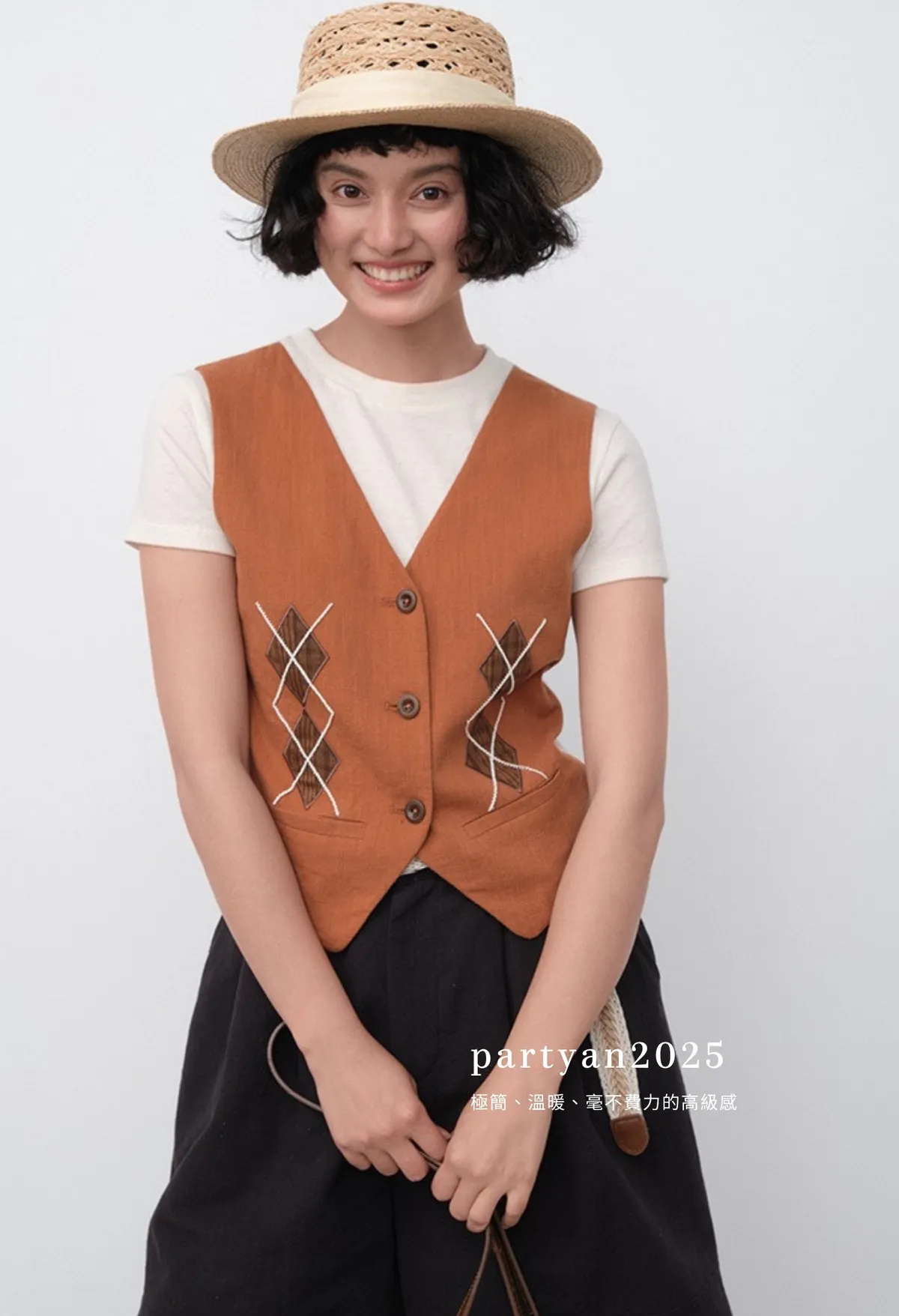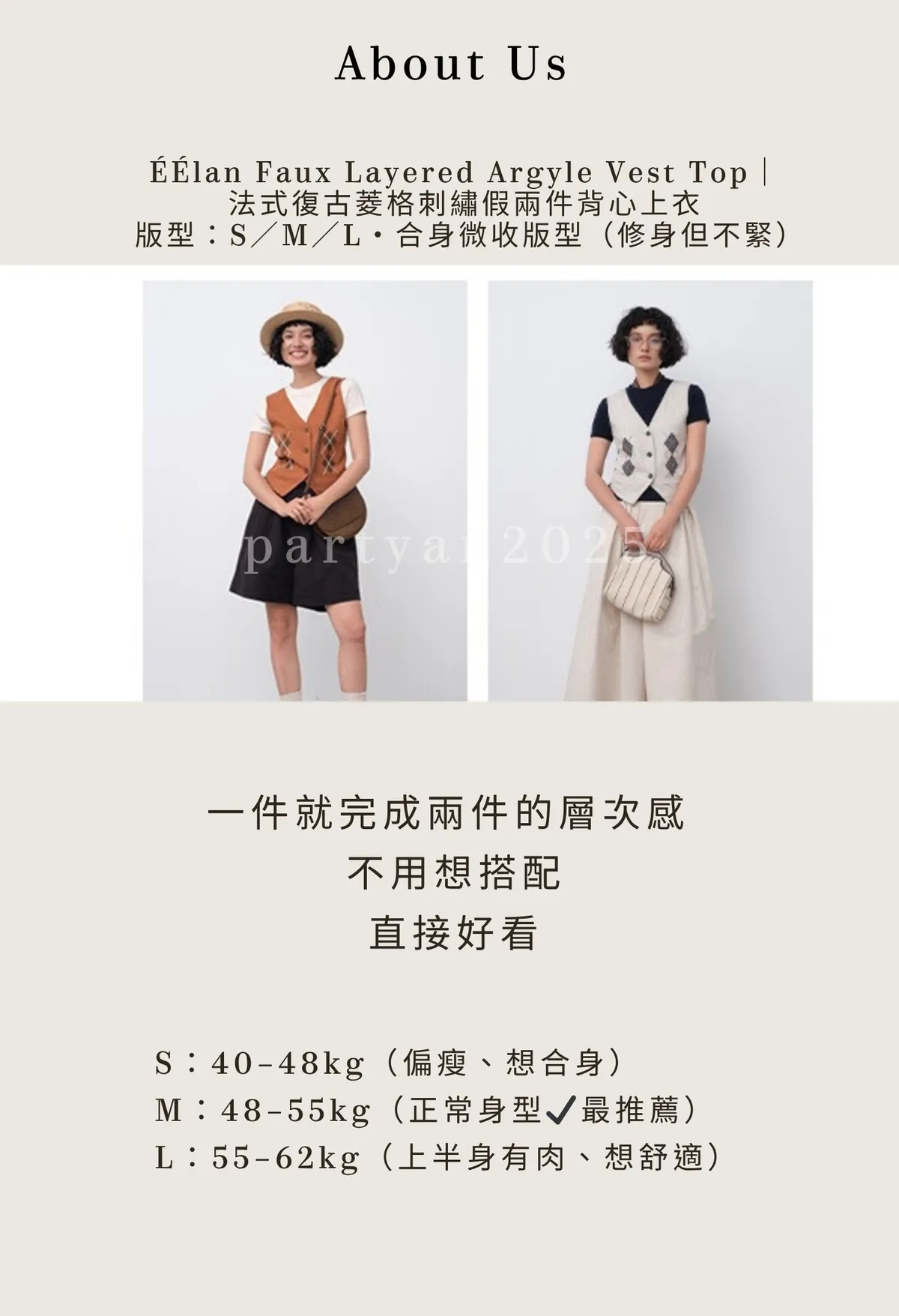 Partyan 設計Élan Faux Layered Argyle Vest Top|法式復古菱格刺繡假兩件背心上衣