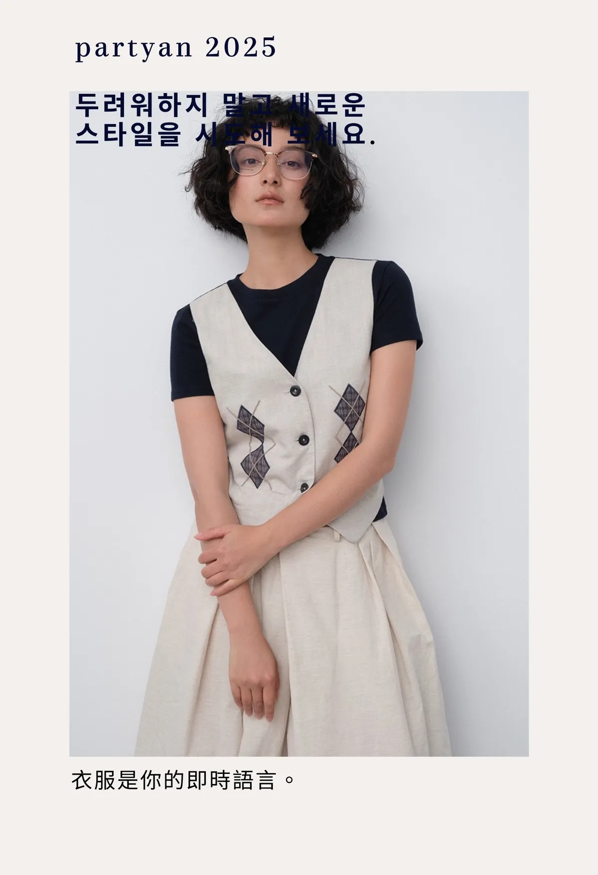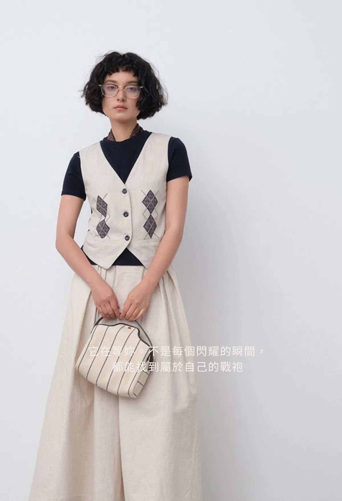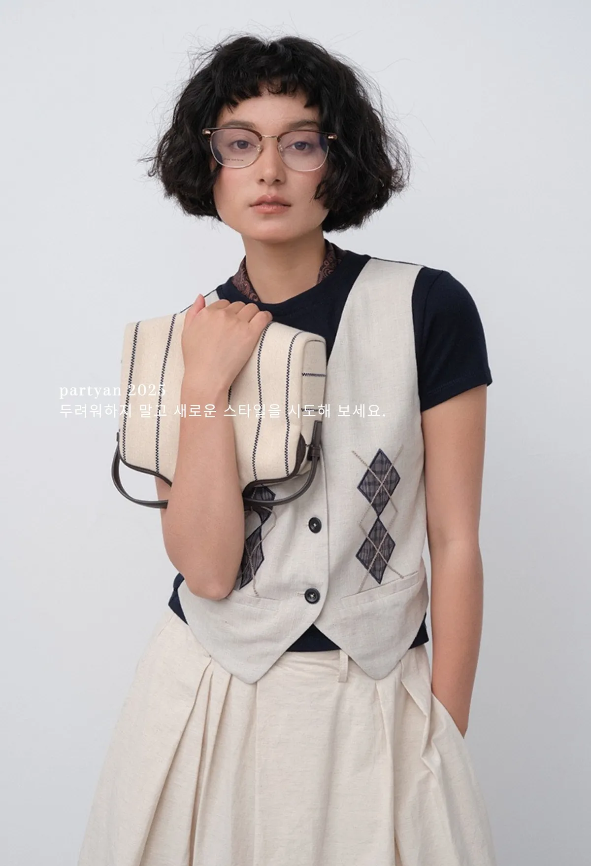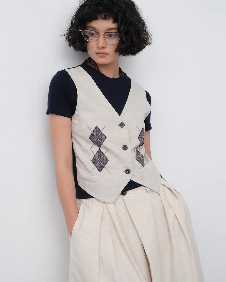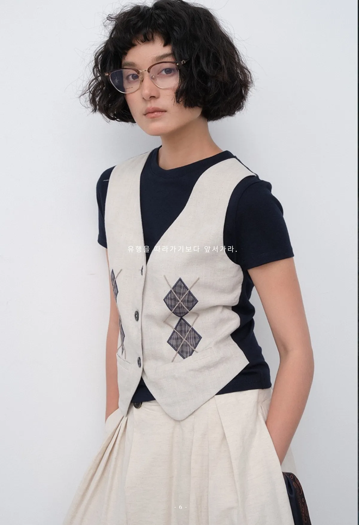 Partyan 設計Élan Faux Layered Argyle Vest Top|法式復古菱格刺繡假兩件背心上衣