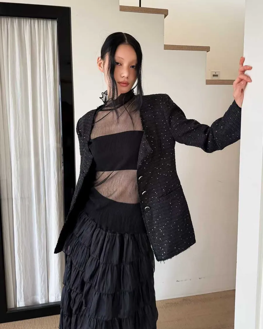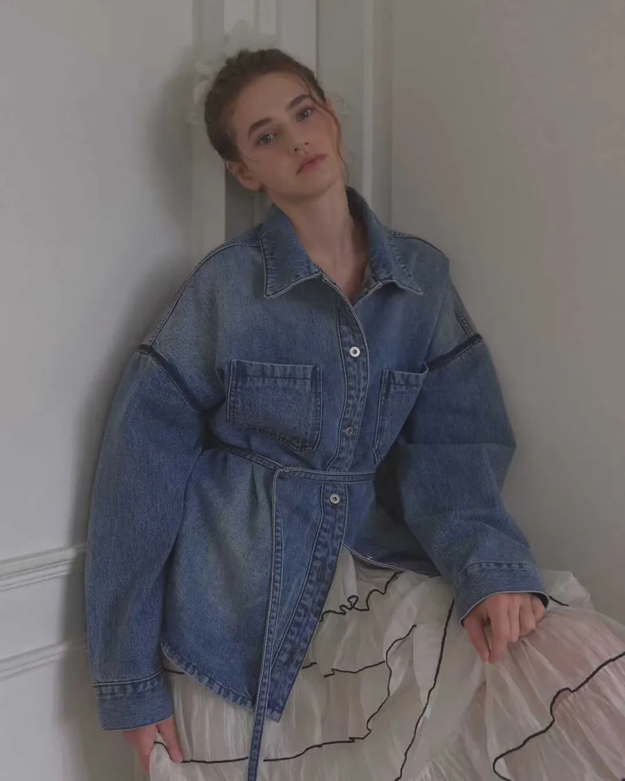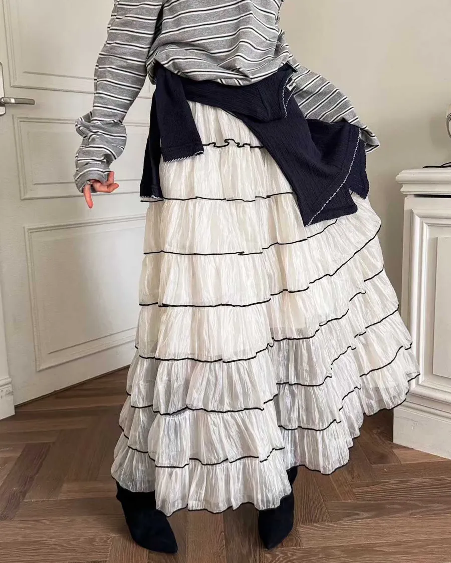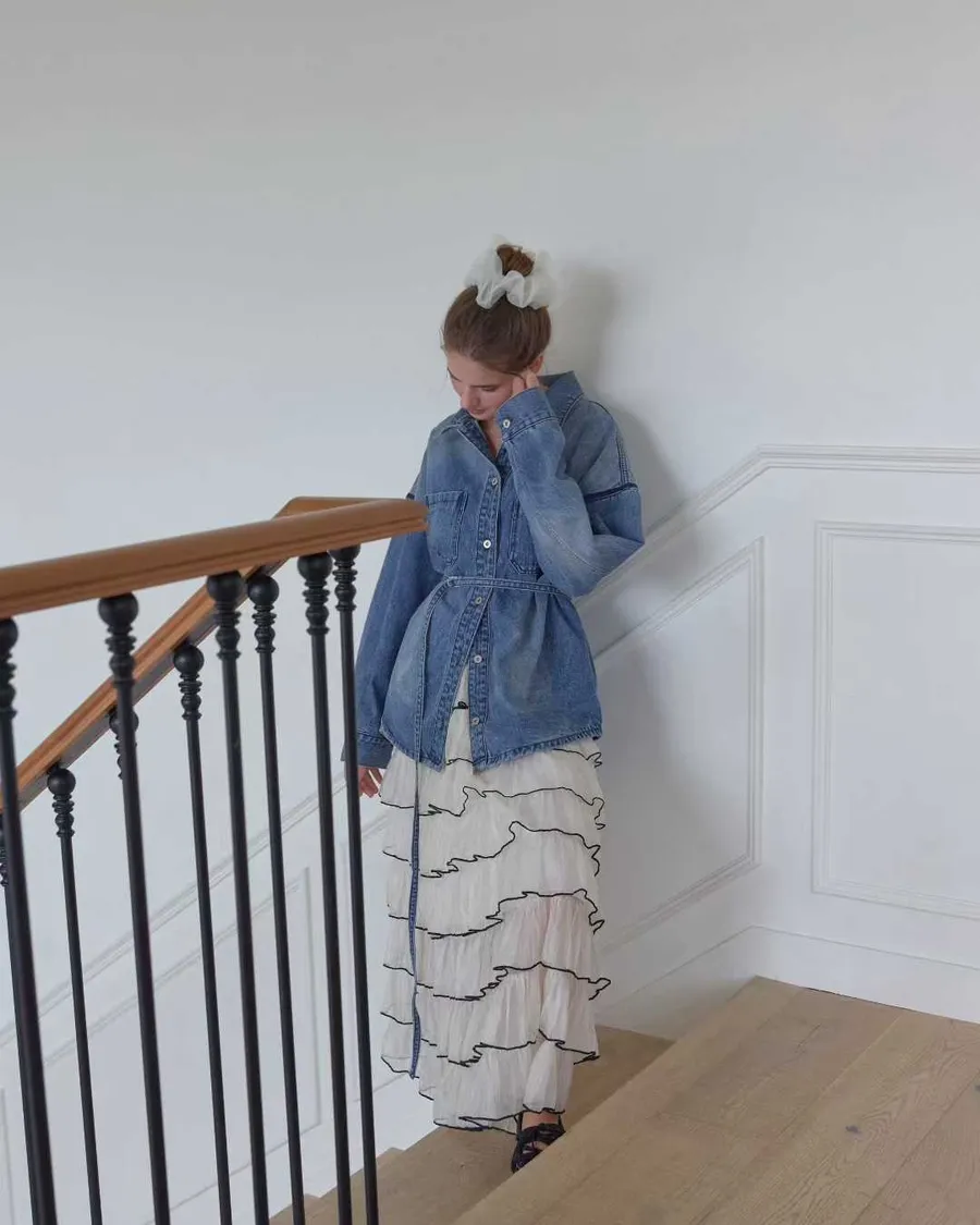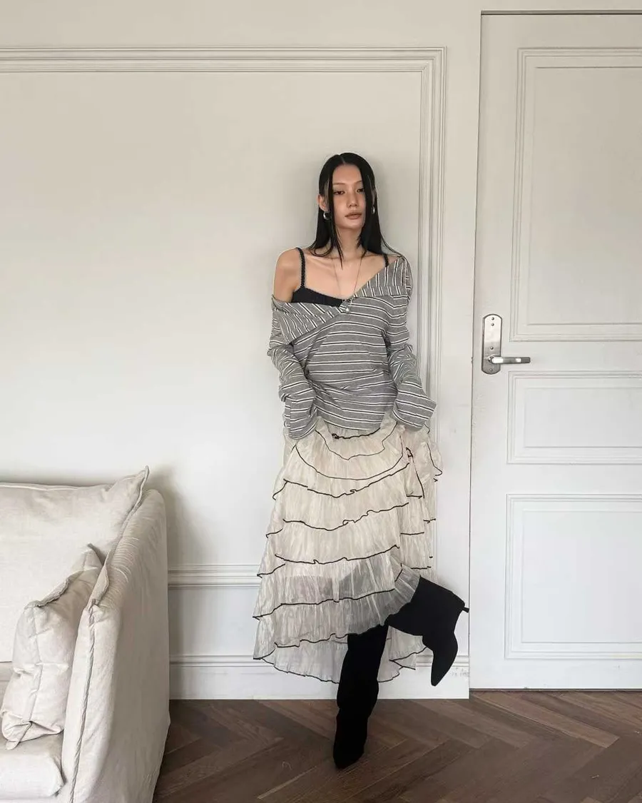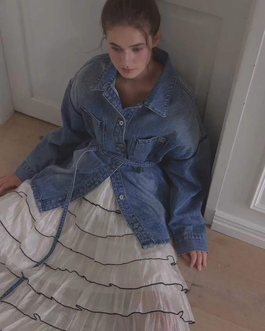 - 層層波浪剪裁+對比滾邊線條,強化立體層次。