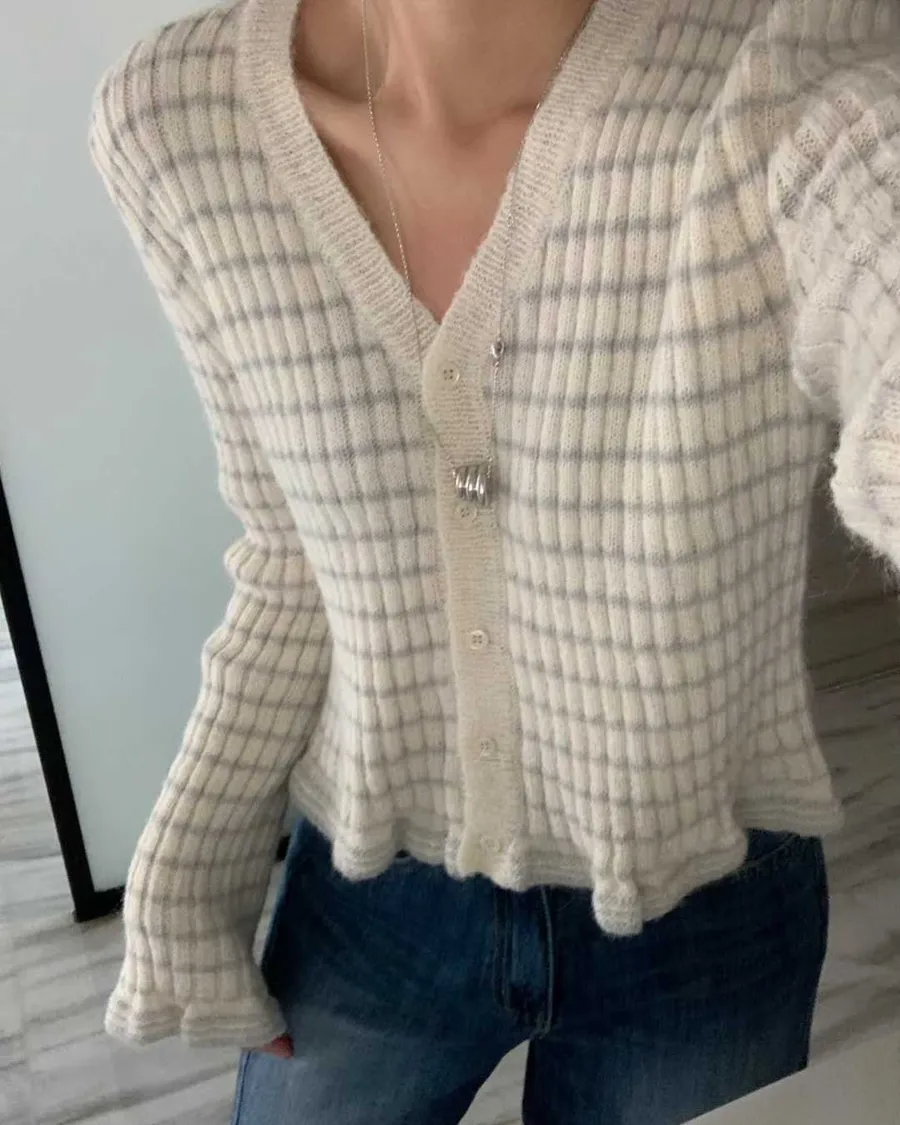 短版V領開襟設計,修飾鎖骨線條與上半身比例。