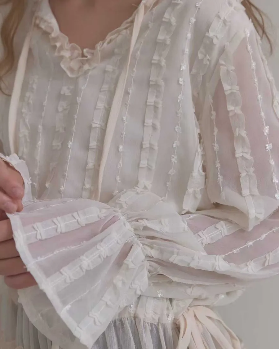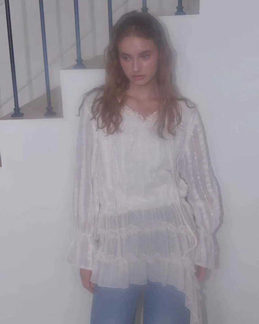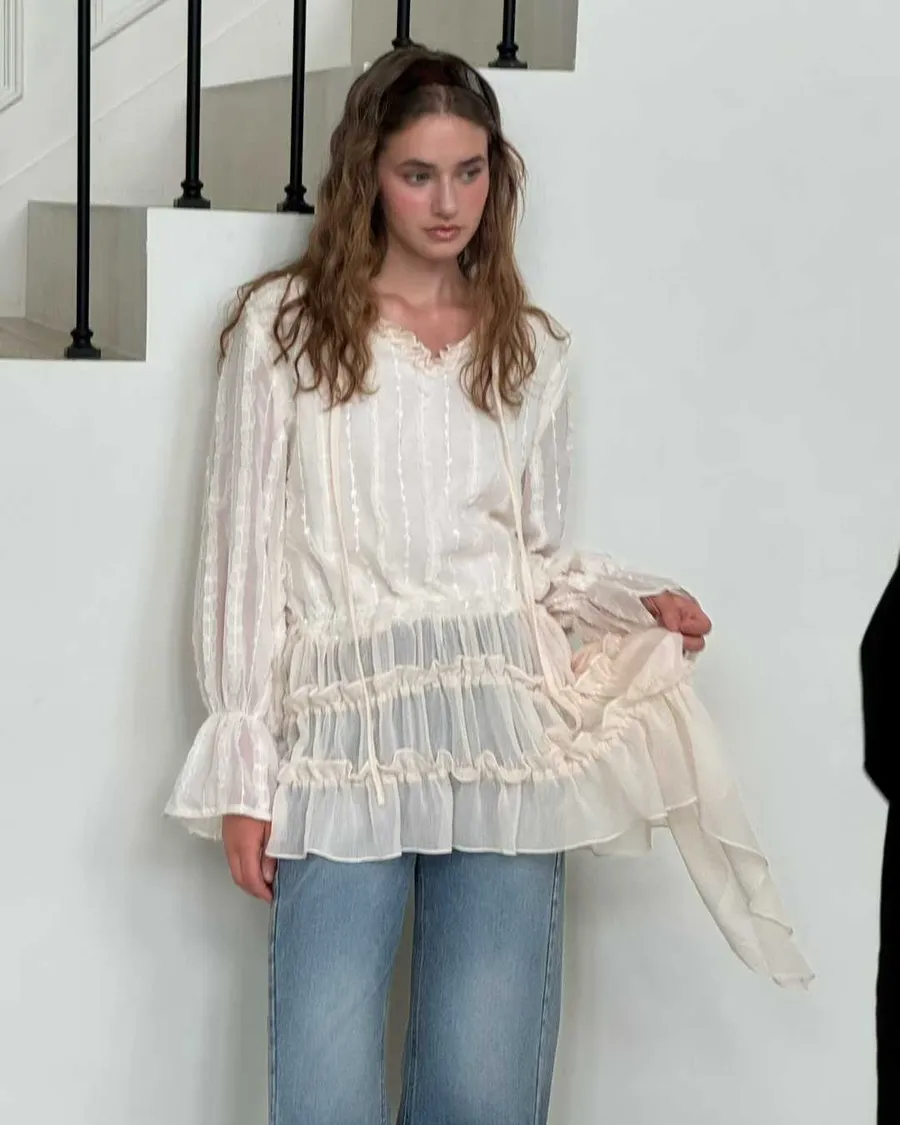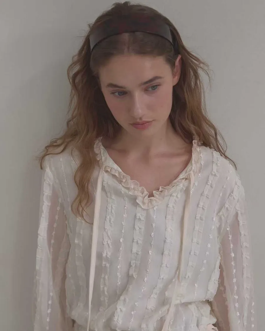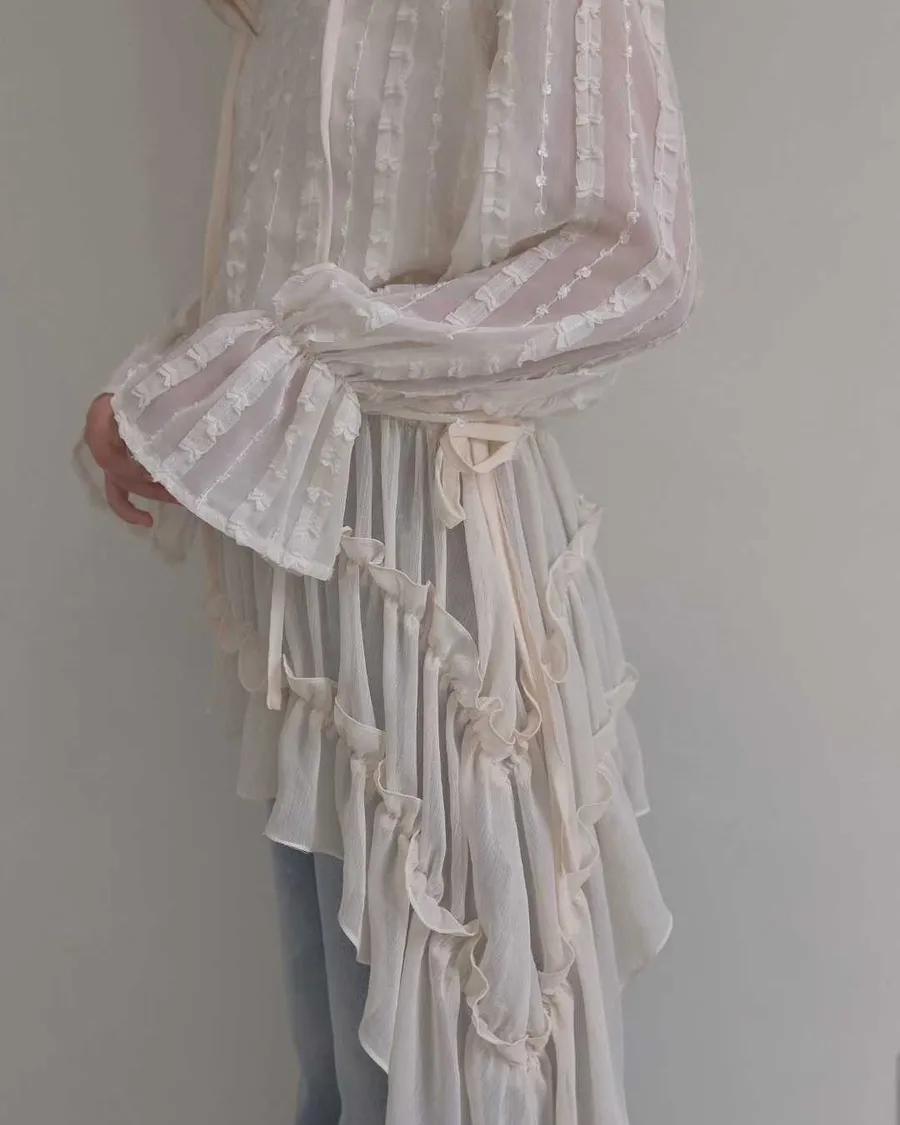 PARTYAN 韓國直送 Maison Volant Ruffled Blouse|高訂系列浮光荷葉壓紋雪紡上衣