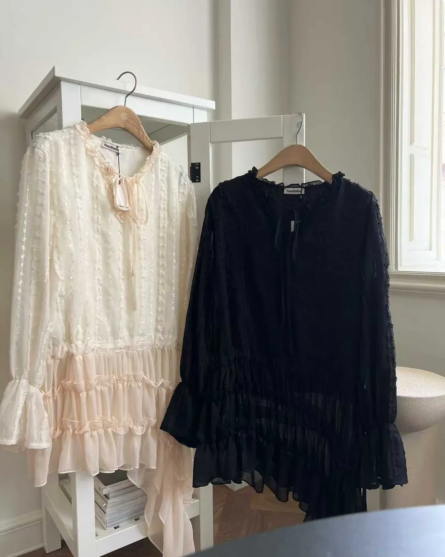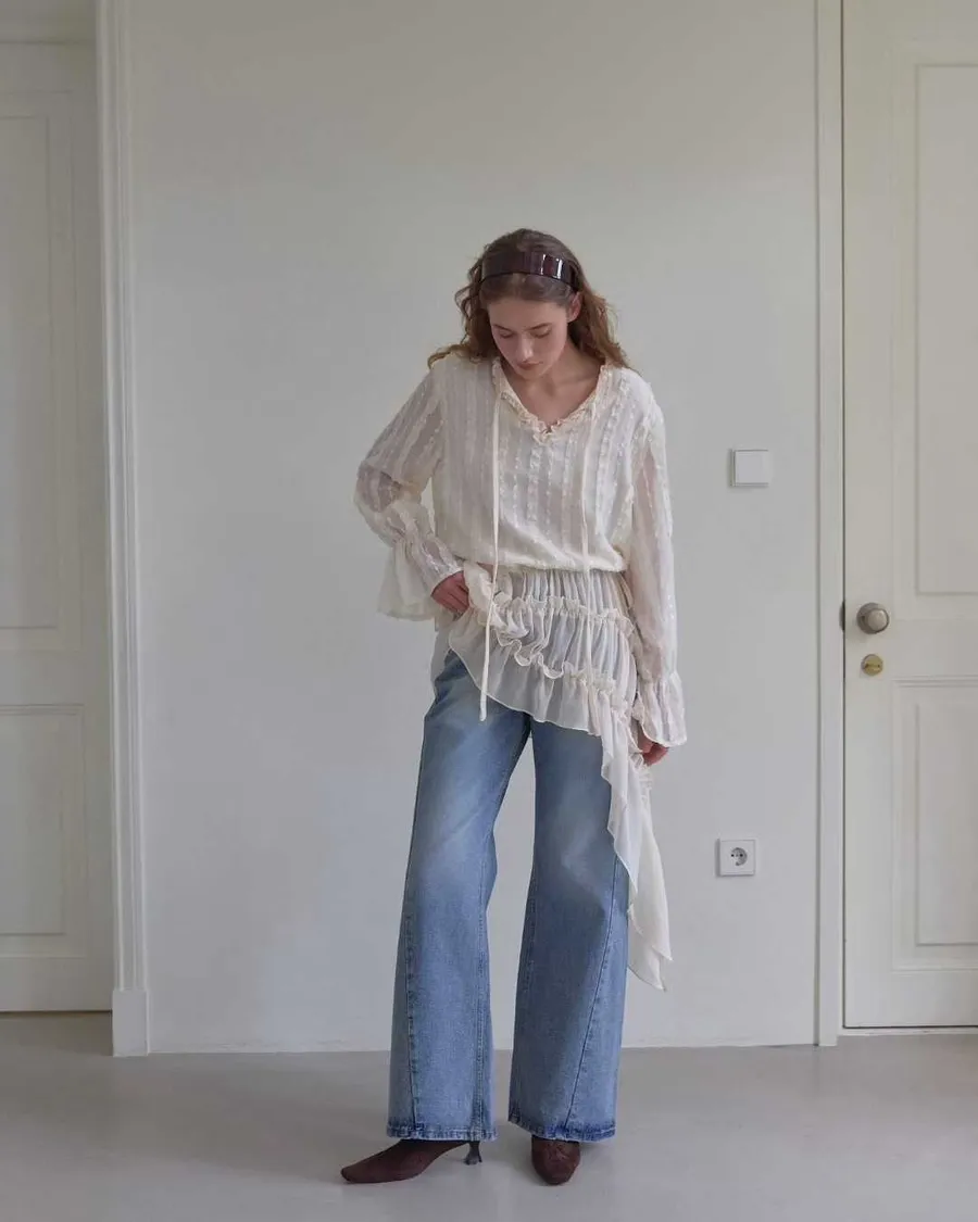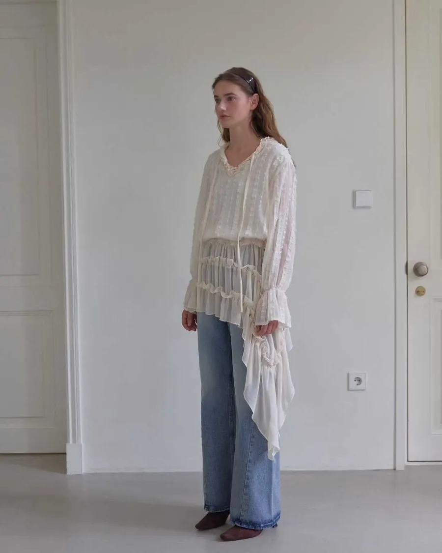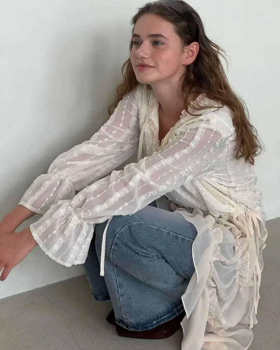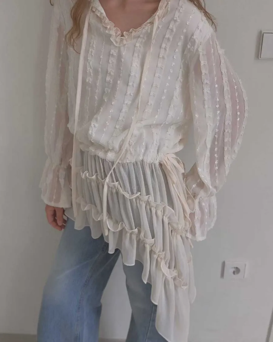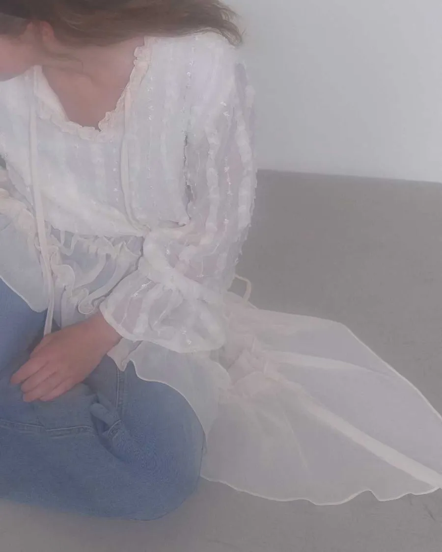 PARTYAN 韓國直送 Maison Volant Ruffled Blouse|高訂系列浮光荷葉壓紋雪紡上衣