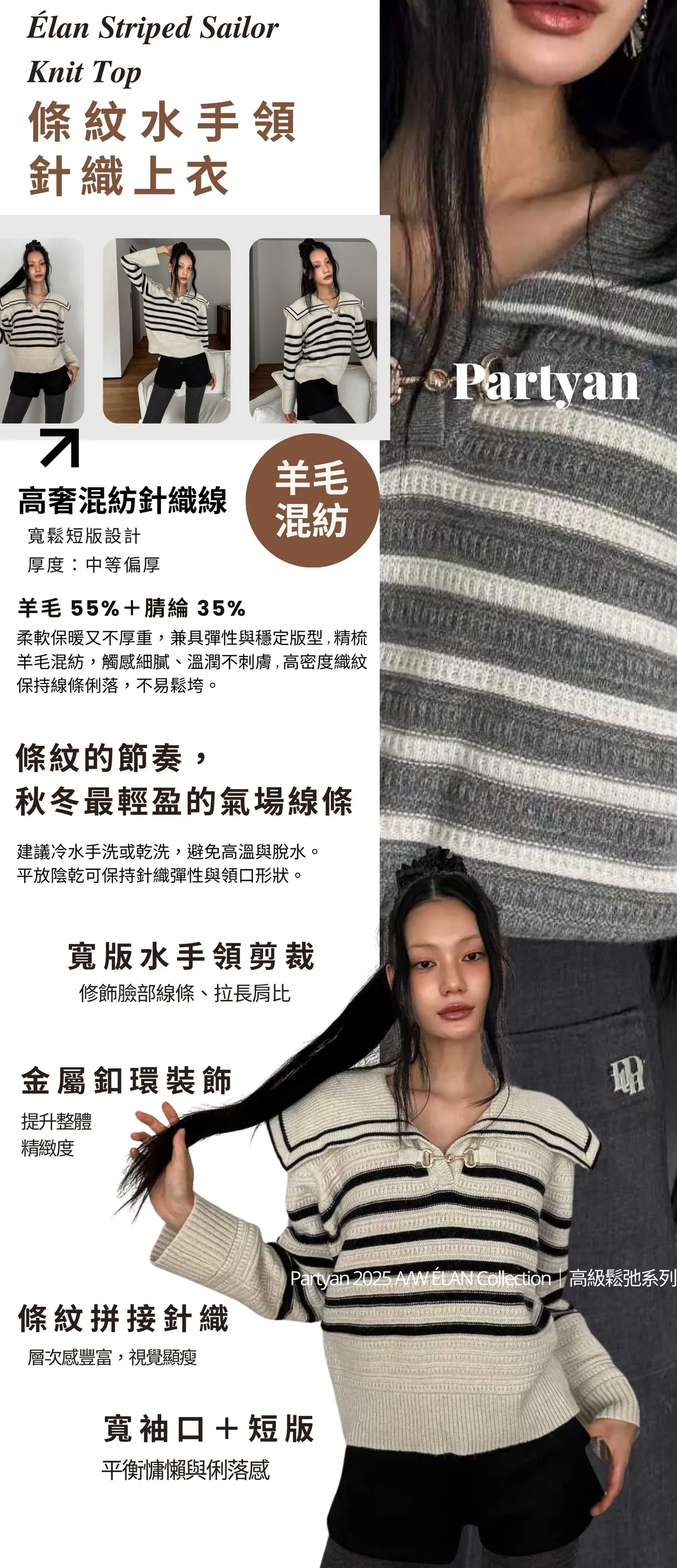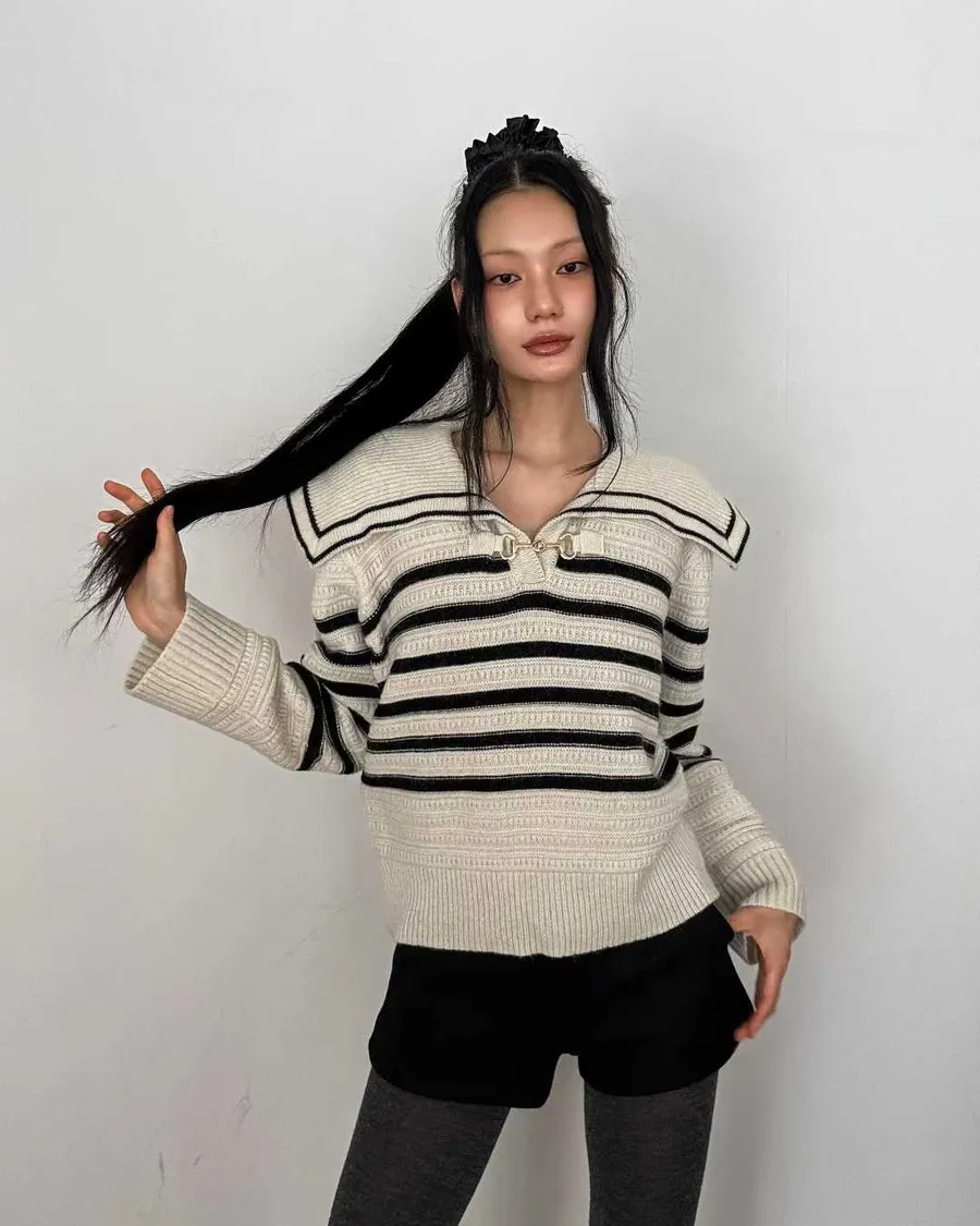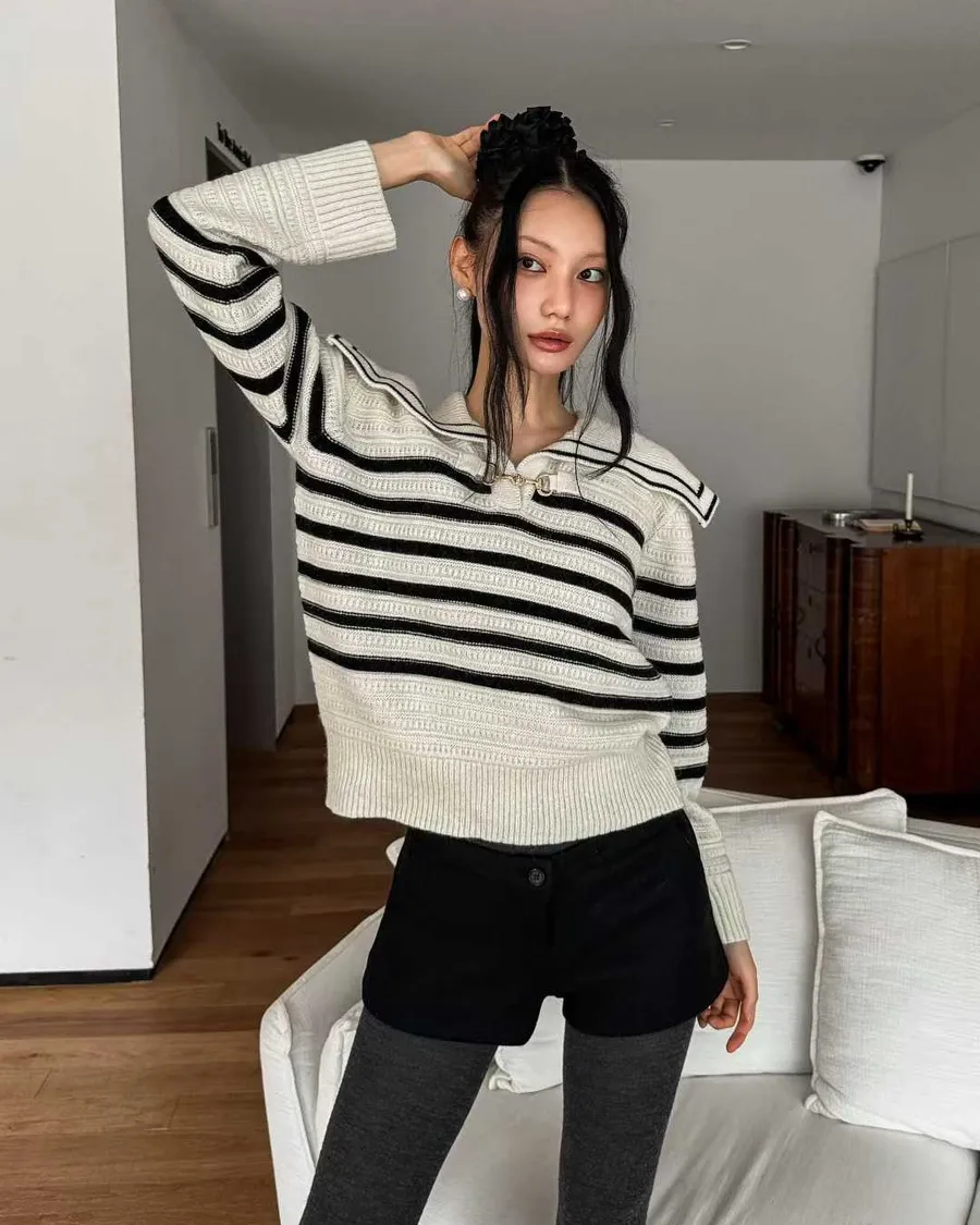 PARTYAN 韓國直送 Élan Striped Sailor Knit Top|條紋水手領針織上衣