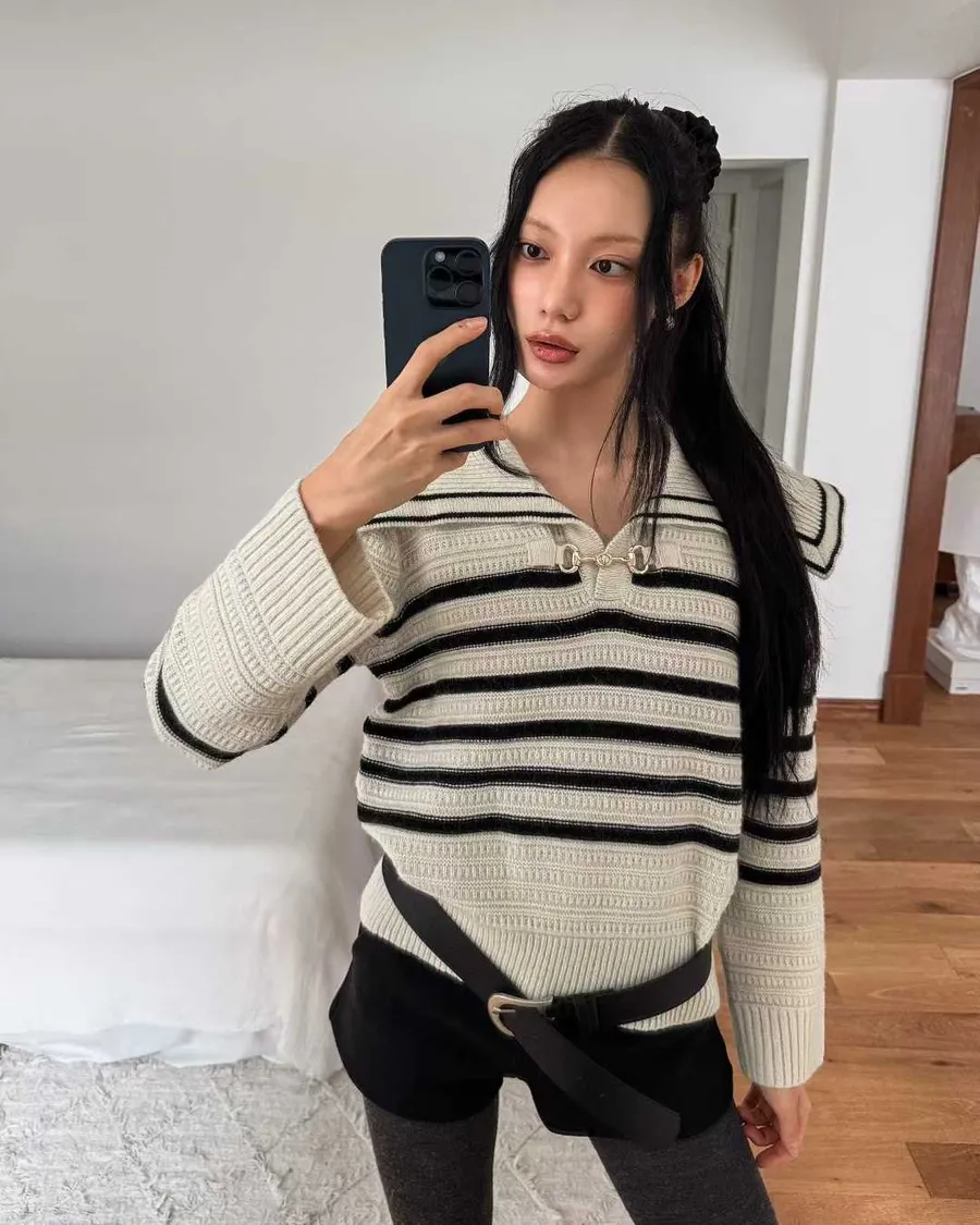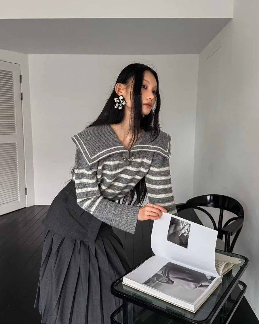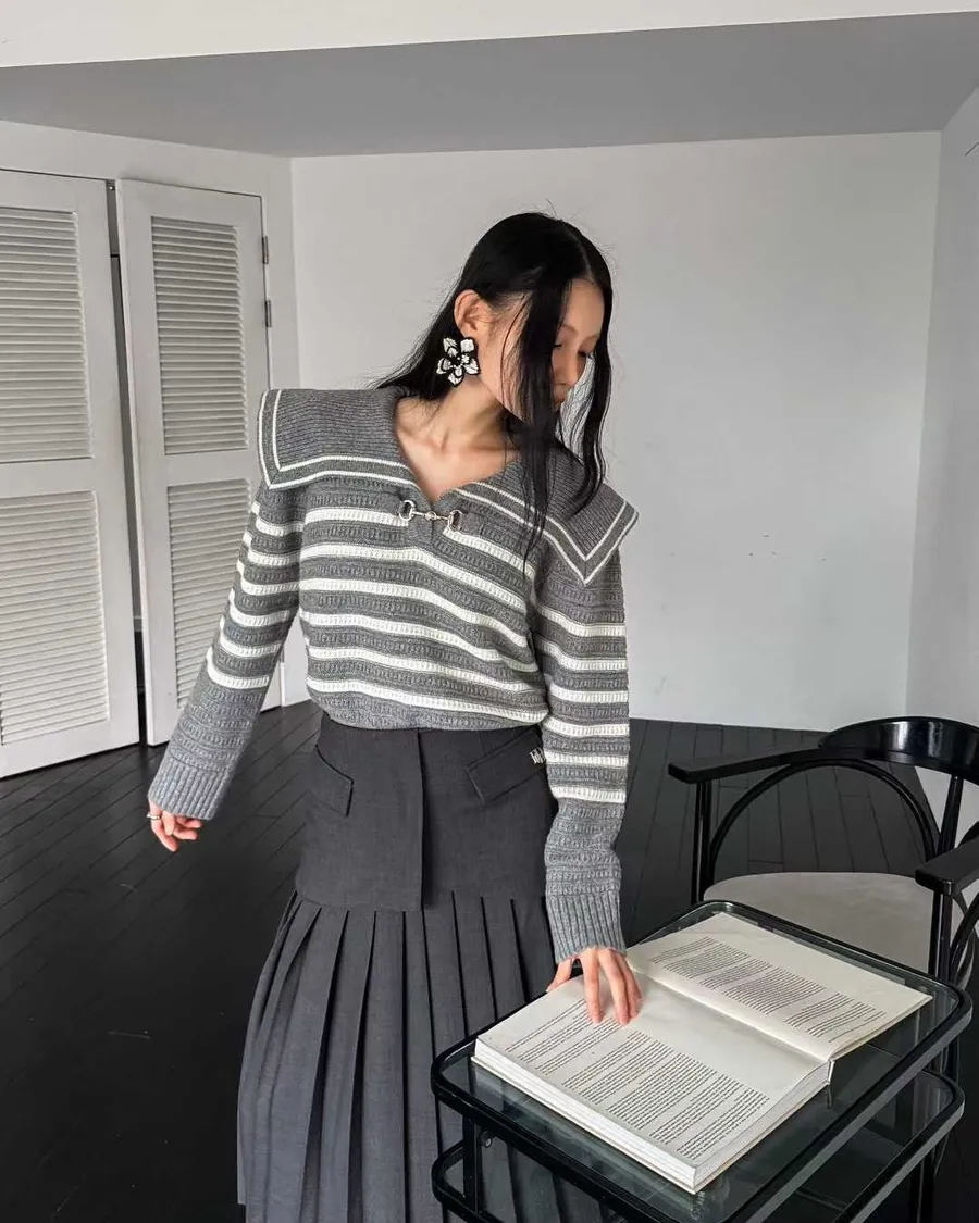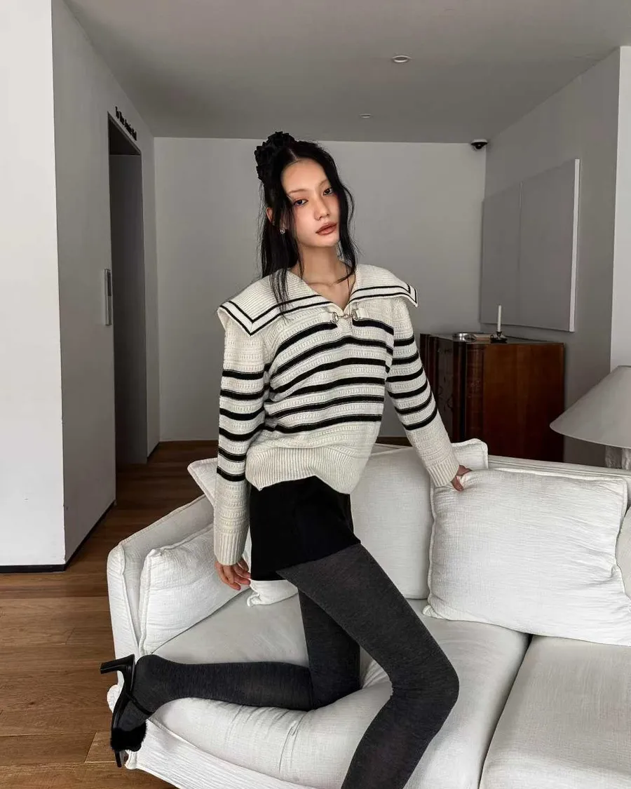 PARTYAN 韓國直送 Élan Striped Sailor Knit Top|條紋水手領針織上衣