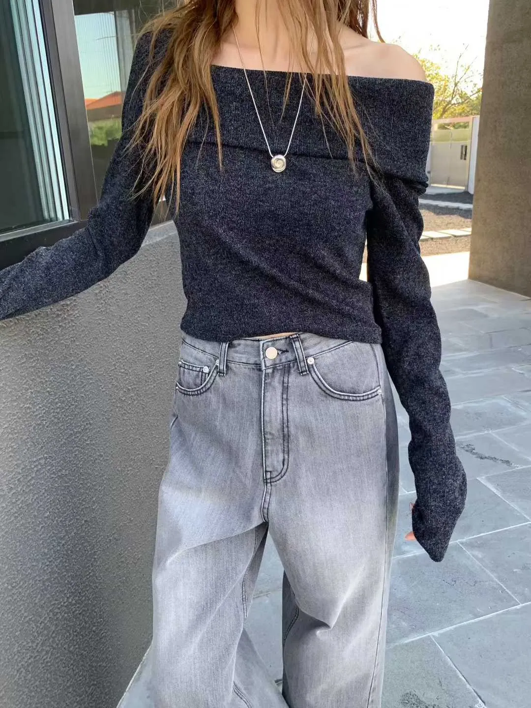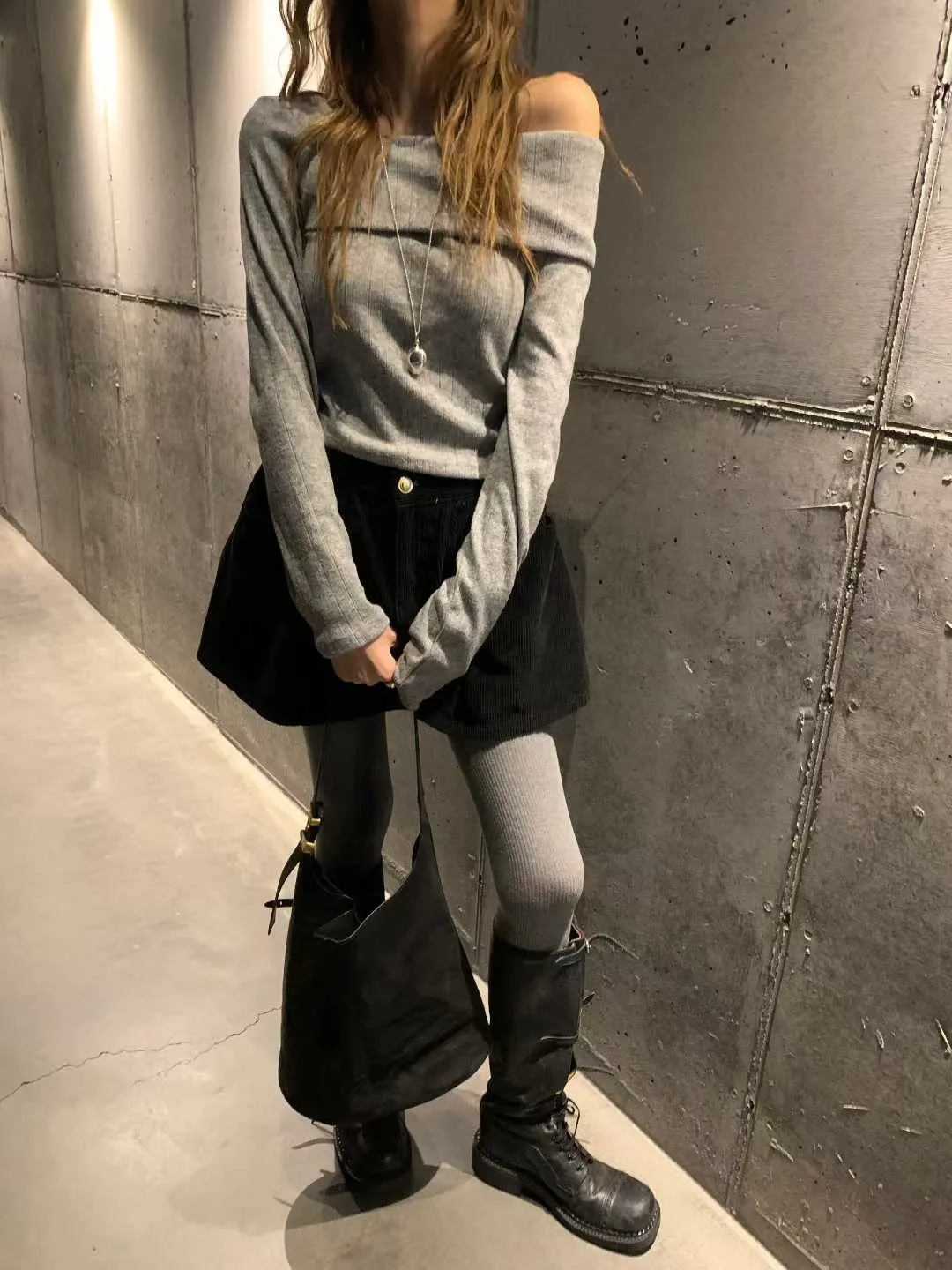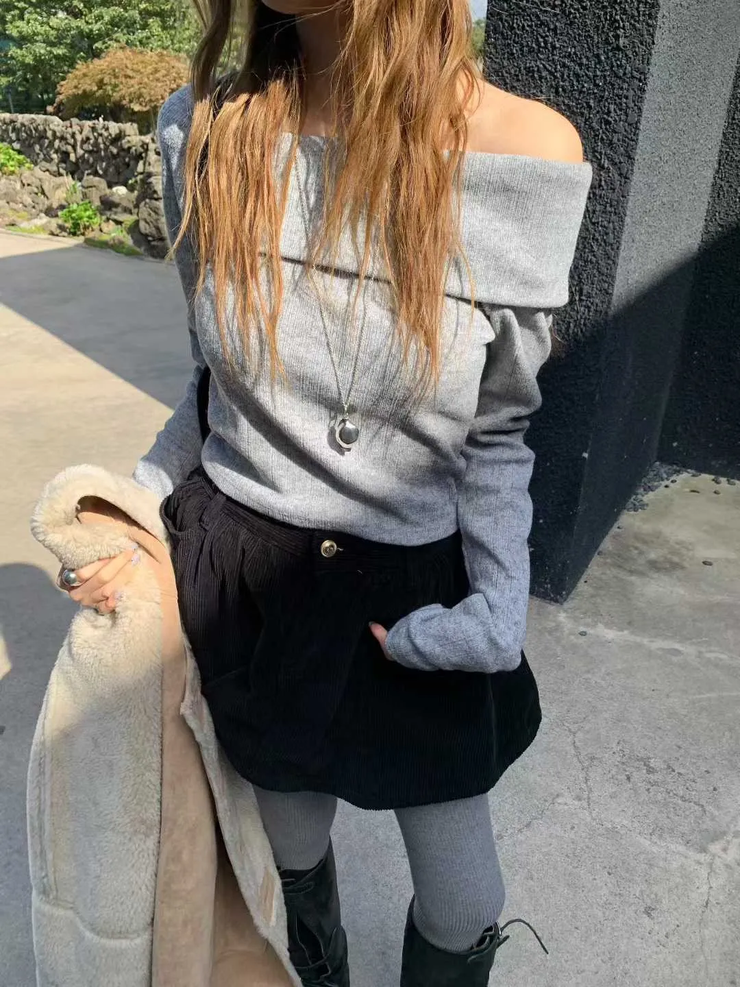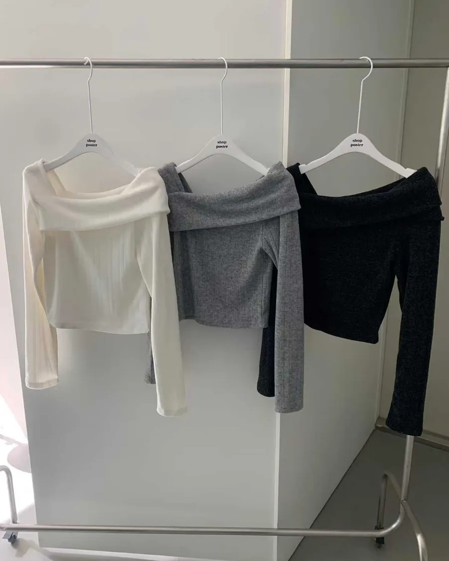 斜肩與大翻領設計自然露出鎖骨線條,