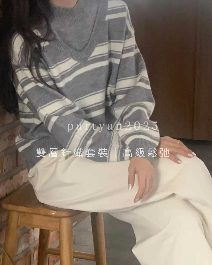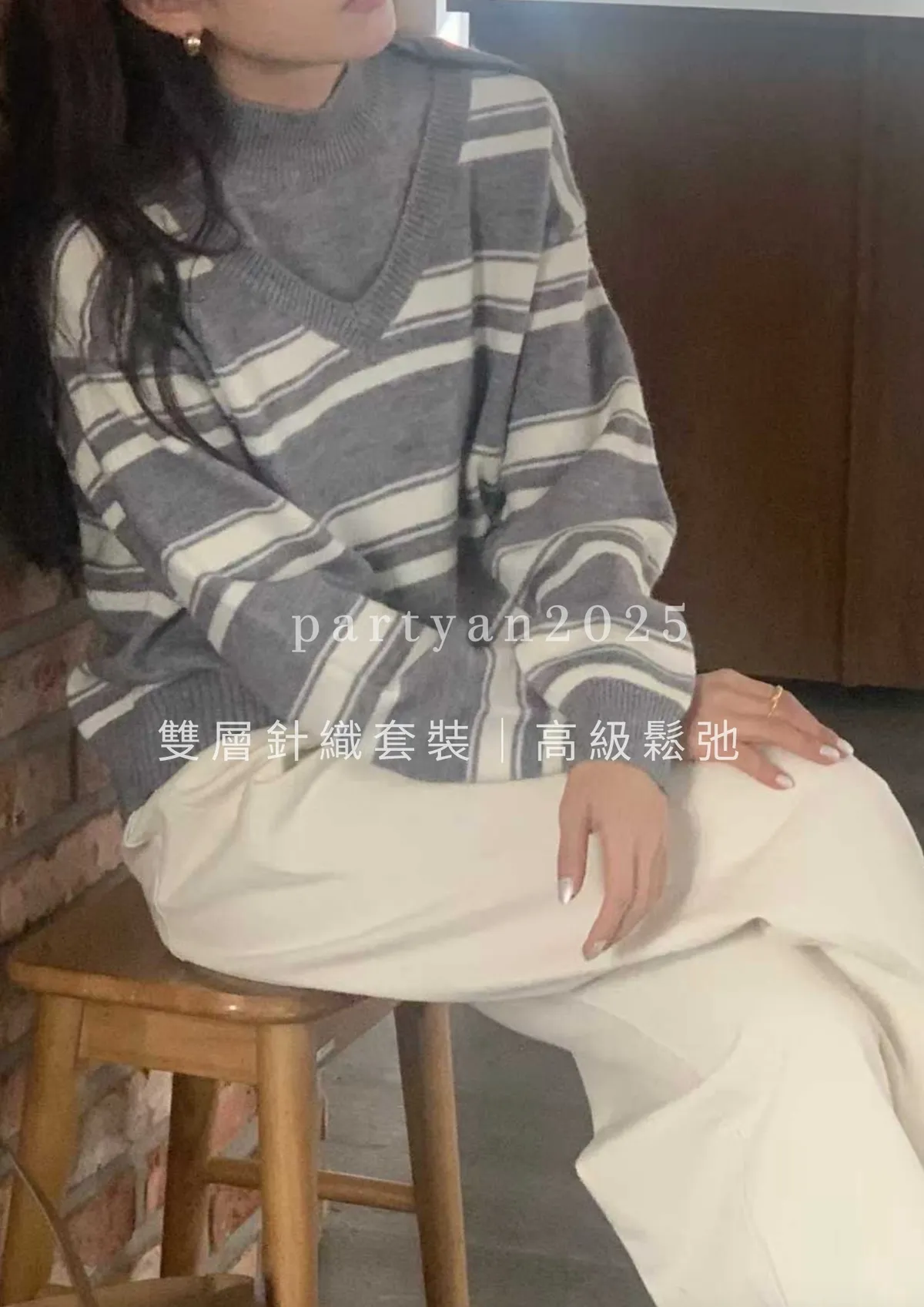 PARTYAN 韓國直送 PARTYAN 韓國直送 貝金雙層針織套裝|高級鬆弛