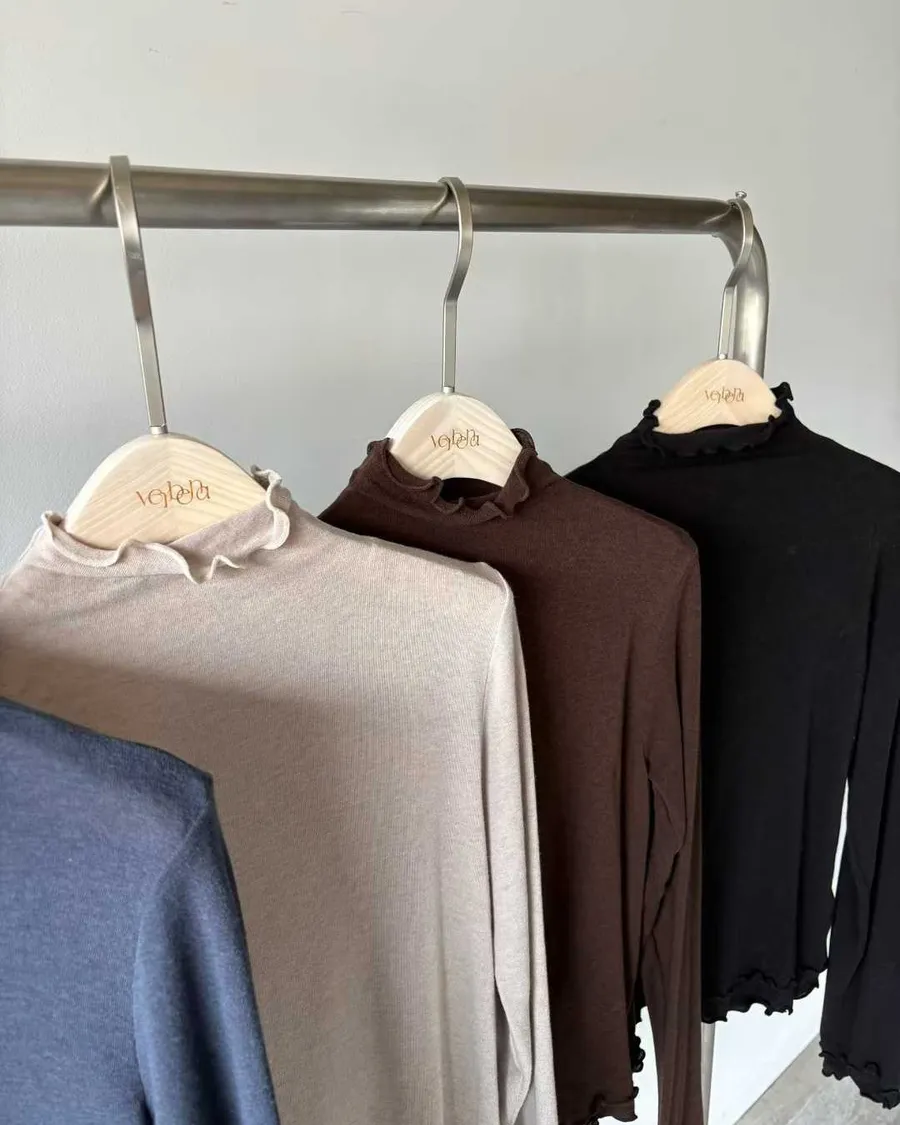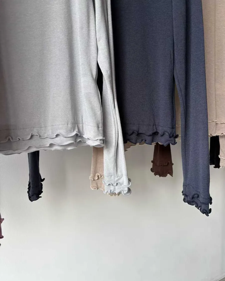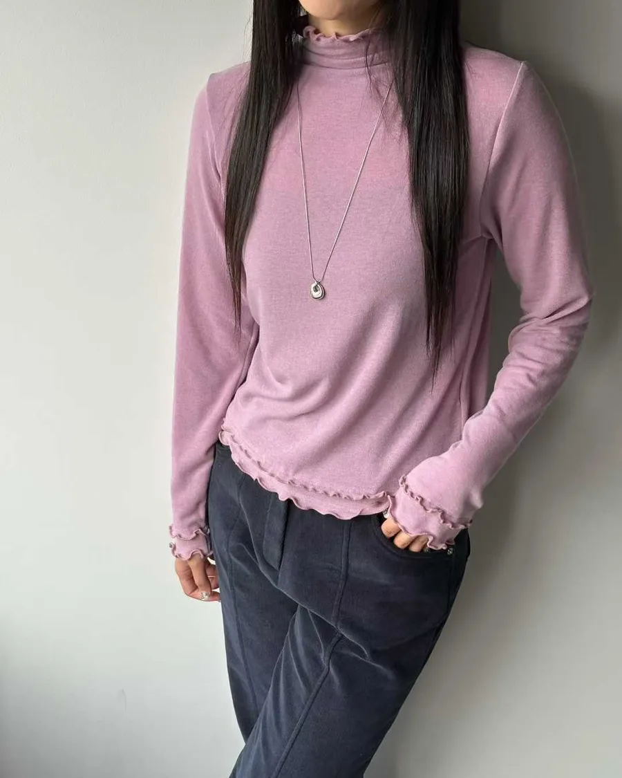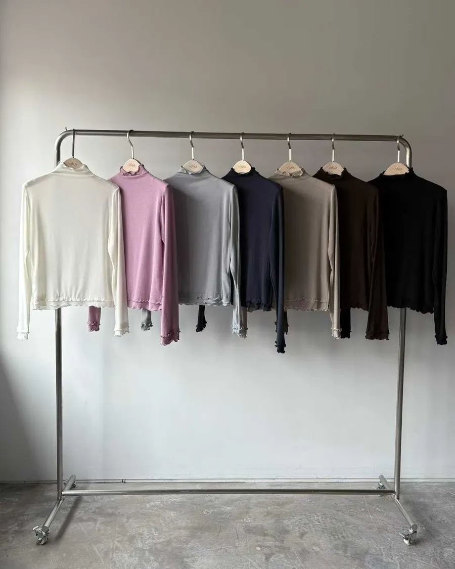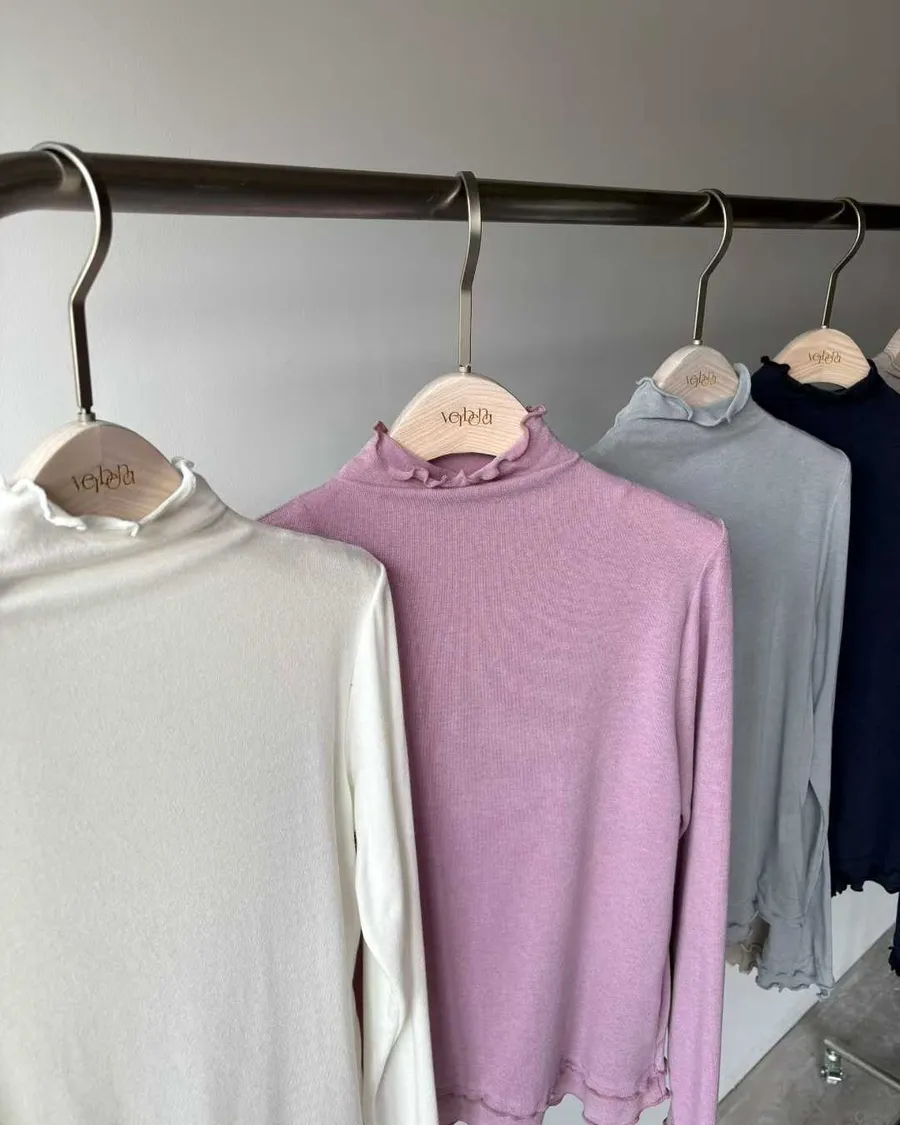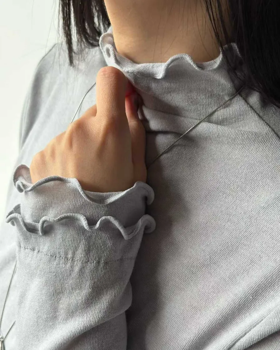 高領微荷葉邊,修飾頸線並展現法式女人味袖口&下擺波浪壓邊,柔和但不甜膩
