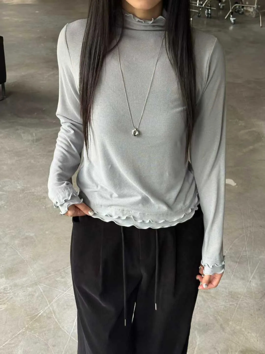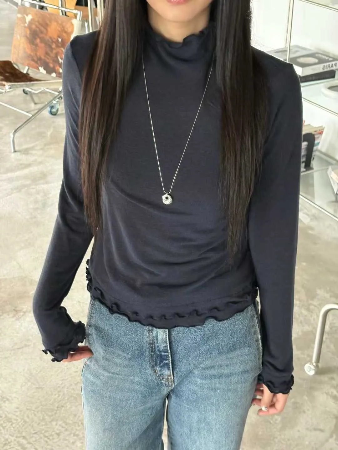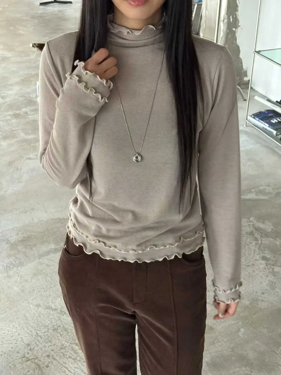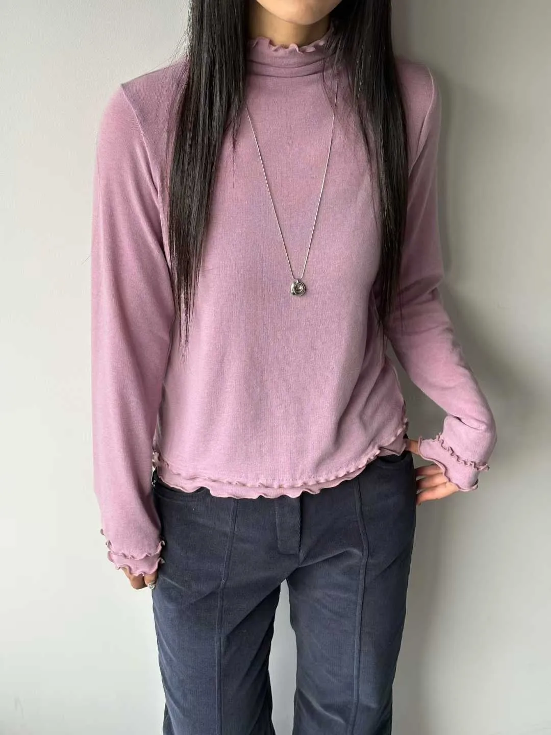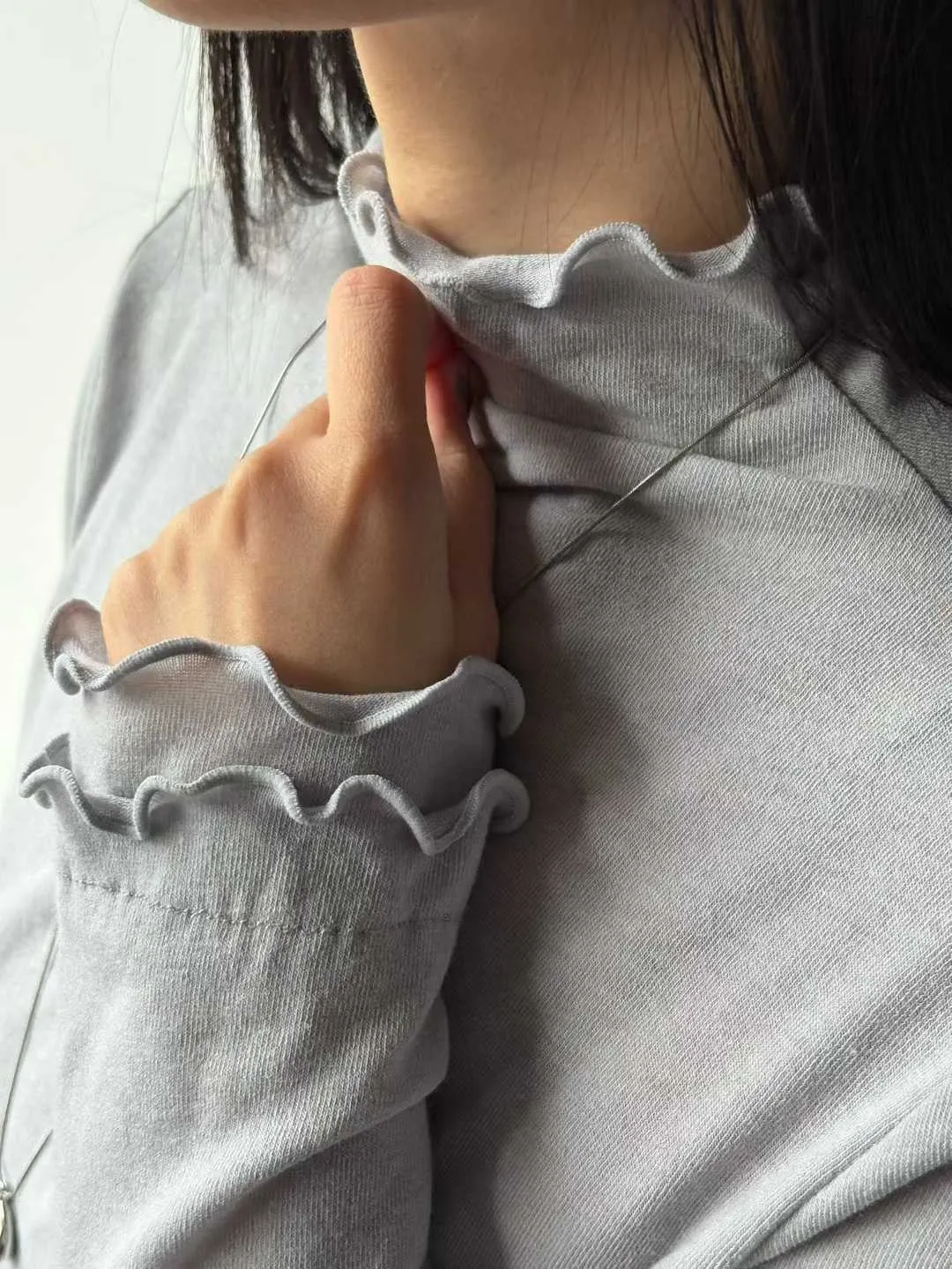高領微荷葉邊,修飾頸線並展現法式女人味袖口&下擺波浪壓邊,柔和但不甜膩
